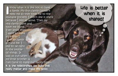 I know what it is like not to have a family. My first family couldn’t keep me so they took me to the Humane Society. I didn’t like it there because I felt all alone. Then my real family came and took me home. Ever since then I want to make sure that I have my family around me. I like to be right in the middle of things. It was so fun when my little brother (a cat) came to make our family bigger.
