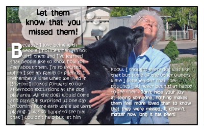 Because I love being with people I notice when I’m not with them and I’ve learned that people like to know how you feel about them. I’m so excited when I see my family or friends. I remember a time when we lived in Boston, I looked forward to our afternoon excursions at the dog play area. All the dogs would come and play. Bill surprised us one day by coming home early while we were playing. I was so happy to see him that I couldn’t help but let him know. I thought every dog was like that but some of the other owners were I little jealous that their pouches had never been that happy to see them.