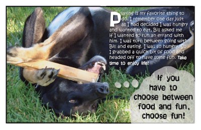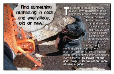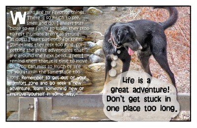 Walks are my favorite things. There is so much to see, smell and do. I always stay close to my family so when they stop to rest (humans aren’t as strong as dogs) I wait patiently for them. Sometimes they rest too long, forgetting the great adventures that are around the next bend. Then I remind them that it is time to move on. You can miss so much of life if you stay in the same place too long.