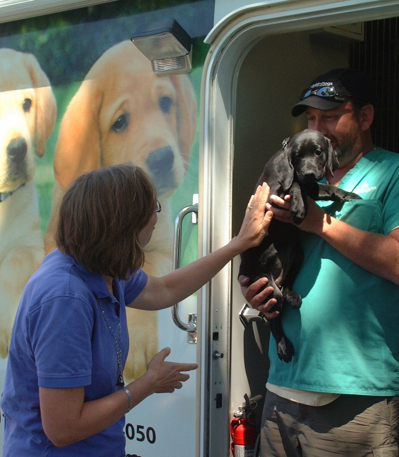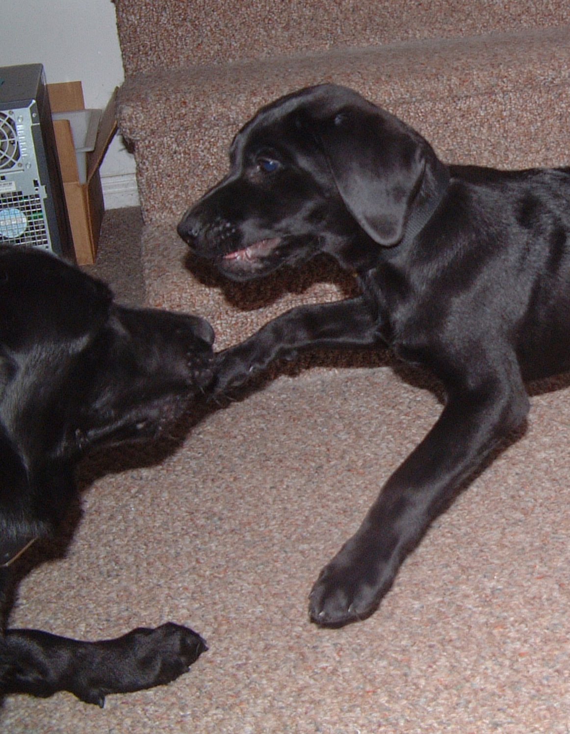 We let Clifford and Casey play a few minutes ago and it was fun to watch. Casey has grown in confidence in the week she has been with us and she held her own with Clifford who is almost a year old and three times her weight. A couple of times Casey latched on to Clifford’s tail. Clifford didn’t quite know what to do, so he went around in circles trying to get her to let go. Mean while Casey is going around in the same circle with her mouth firmly on his tail. It was hilarious – two black labs following each other around and around, a big one and a little one! They enjoyed munching on ice cubes together in the kitchen afterward to cool them down.