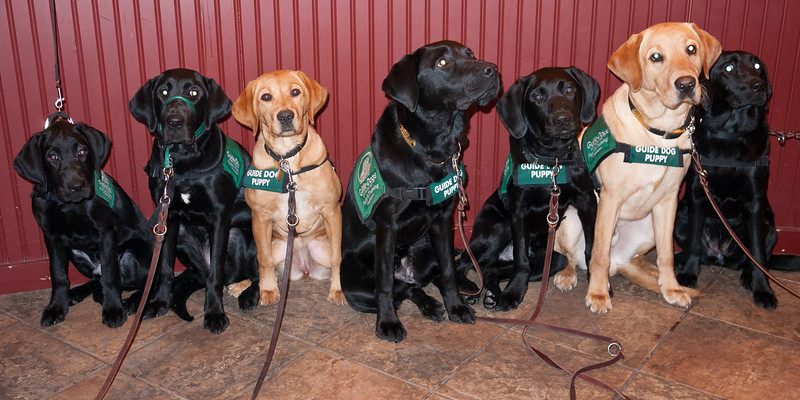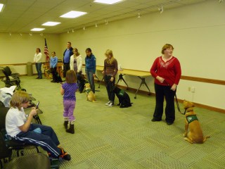 Today was the big regional puppies in training Christmas party at the Center for the Blind. There were more than 30 dogs there, including some career change dogs. It was fun to see Clifford again. We enjoyed a pot-luck meal and then they divided us up into 3 groups to play games. One of them was dog tick-tack-toe. In this version the pup has to stay in a sit or a down. If he gets up then the spot opens up for the other team to take the square. Bruce got this great shot of pup tick-tack-toe.