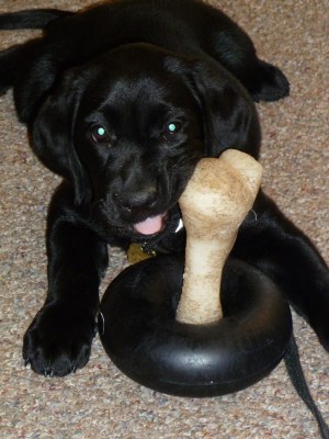 | Yakira chewing on a big nylabone stuck in the middle of a Goughnut Max |
