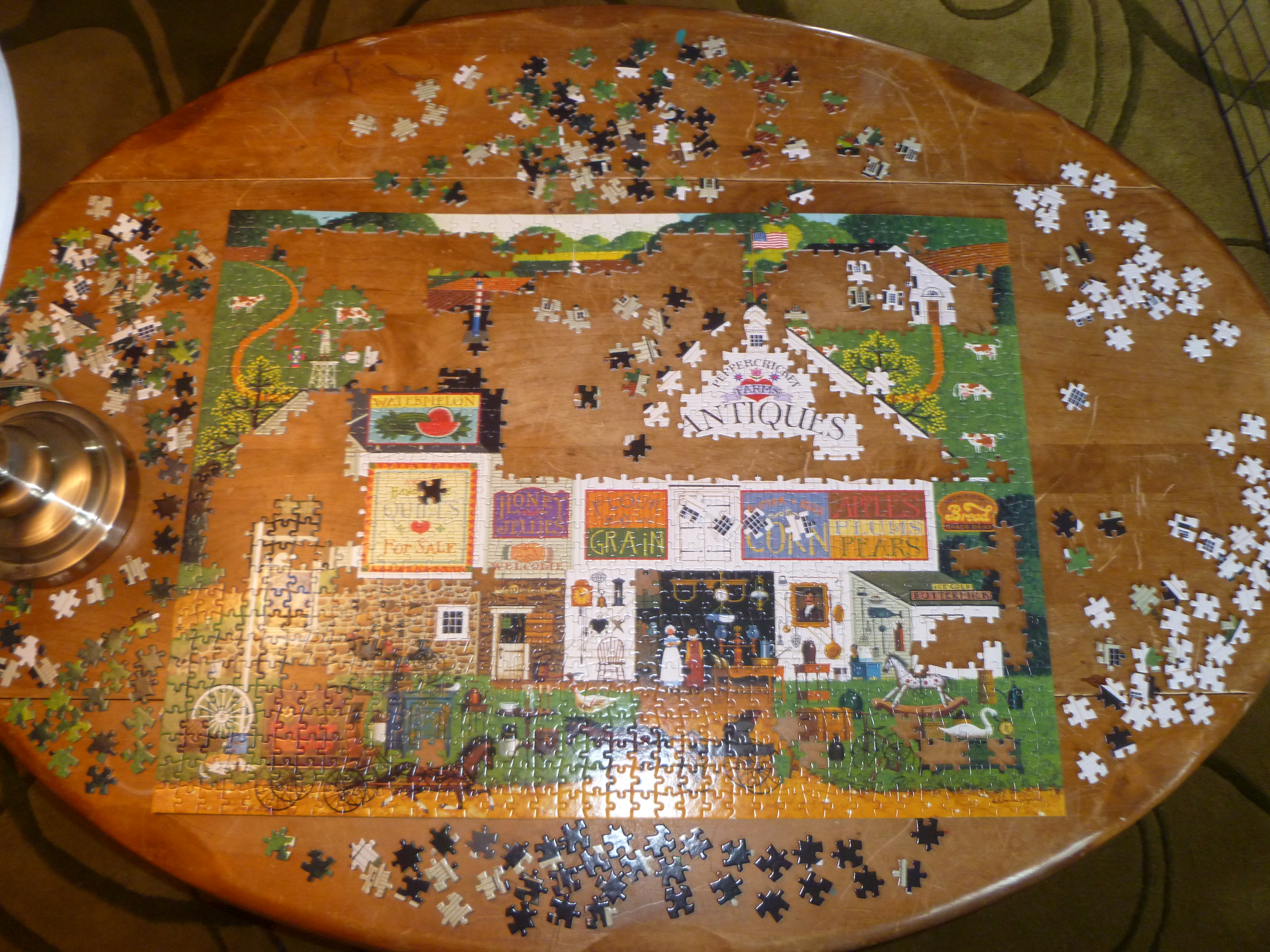 I always enjoyed jigsaw puzzles growing up and even as an adult but it has been at least 10 years since I took the time to put a puzzle together. So I thought it would be a good activity for my 50th year celebration. I picked up a 1,00 piece puzzle while I was out running errands this week and we started on it on Friday evening. The puzzle I picked was an image by folk artist Charles Wysocki. His painting remind me of my days working at Coni’s Art Warehouse in Lindon.