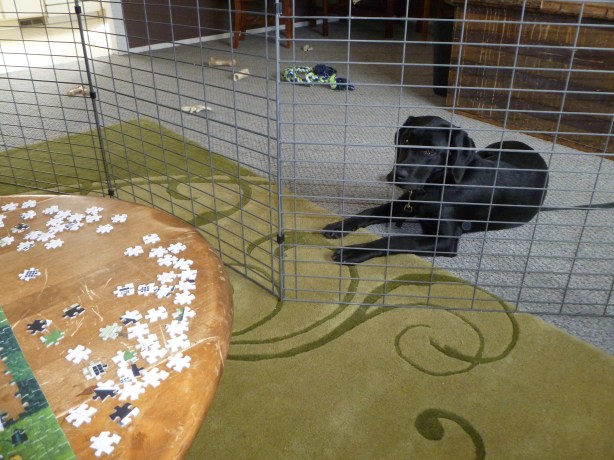 We got all the edge pieces done and then went about our other evening activities. As we were getting ready for bed, I found Bill back at the puzzle and I made the mistake of sitting down at the coffee table too just to put in a couple of pieces. Well, one piece lead to another and next thing we knew it was 3 in the morning. Thank goodness we didn’t have any commitments on Saturday until 11: 30 a.m. It was so tempting to start back on the puzzle the next morning but we still had a bit of prep before we went to teach a Dog Care Merit Badge class. So we used all our strength to resist the call of the puzzle.