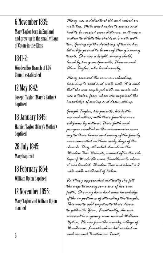 Mary: a small (7×7) book about Mary Taylor’s childhood and her journey to the Salt Lake Valley with the Martin Handcart Company for children under 12 to learn about their pioneer ancestor.