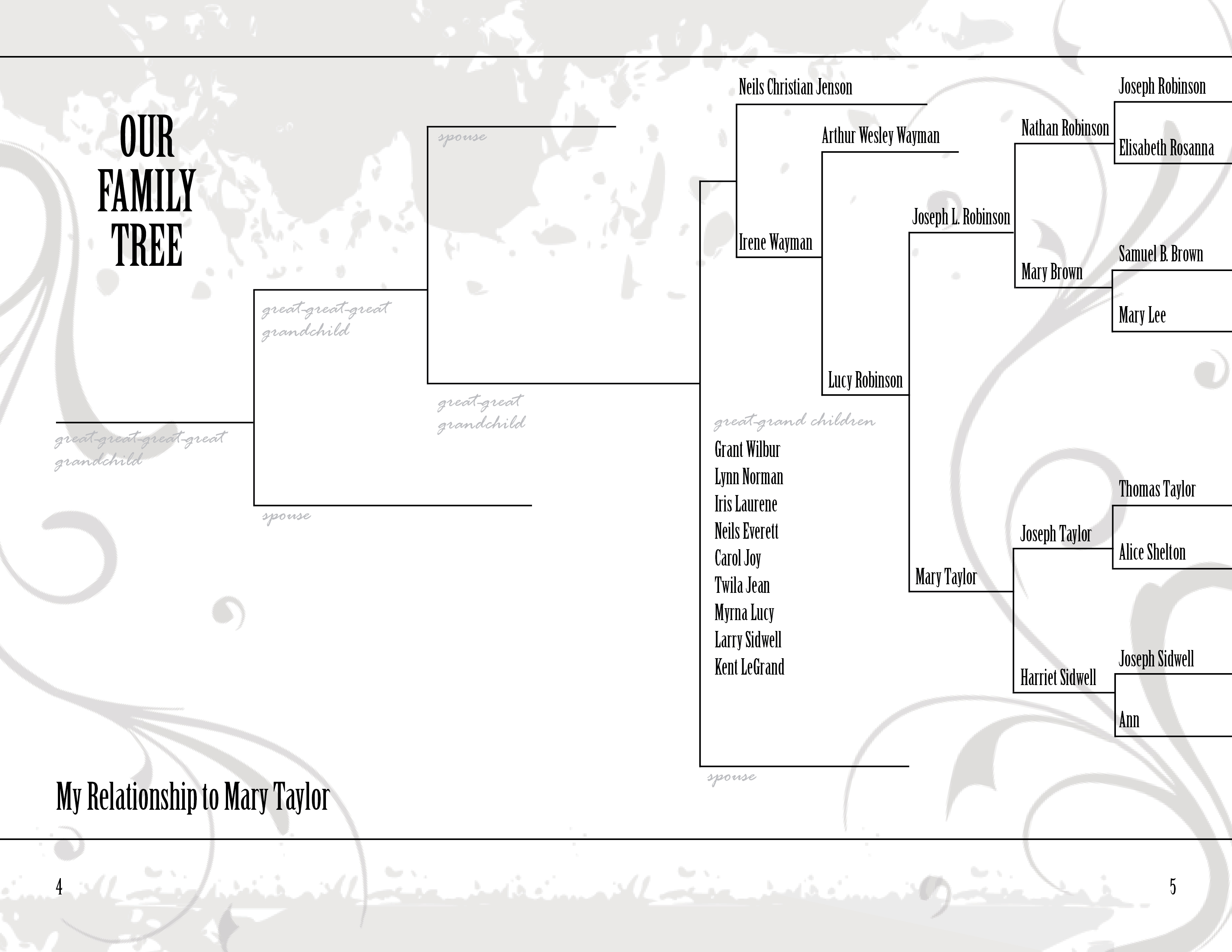 This next spread is for the second step of a generations project – populate your tree. I filled in the basics of the information that is common for everyone who is coming to the reunion. They will each have to fill in the left side of the tree depending on who they are. This was a little tricky to figure out how to lay it out. I hope that it is clear on how each family member connects back to Mary Taylor.