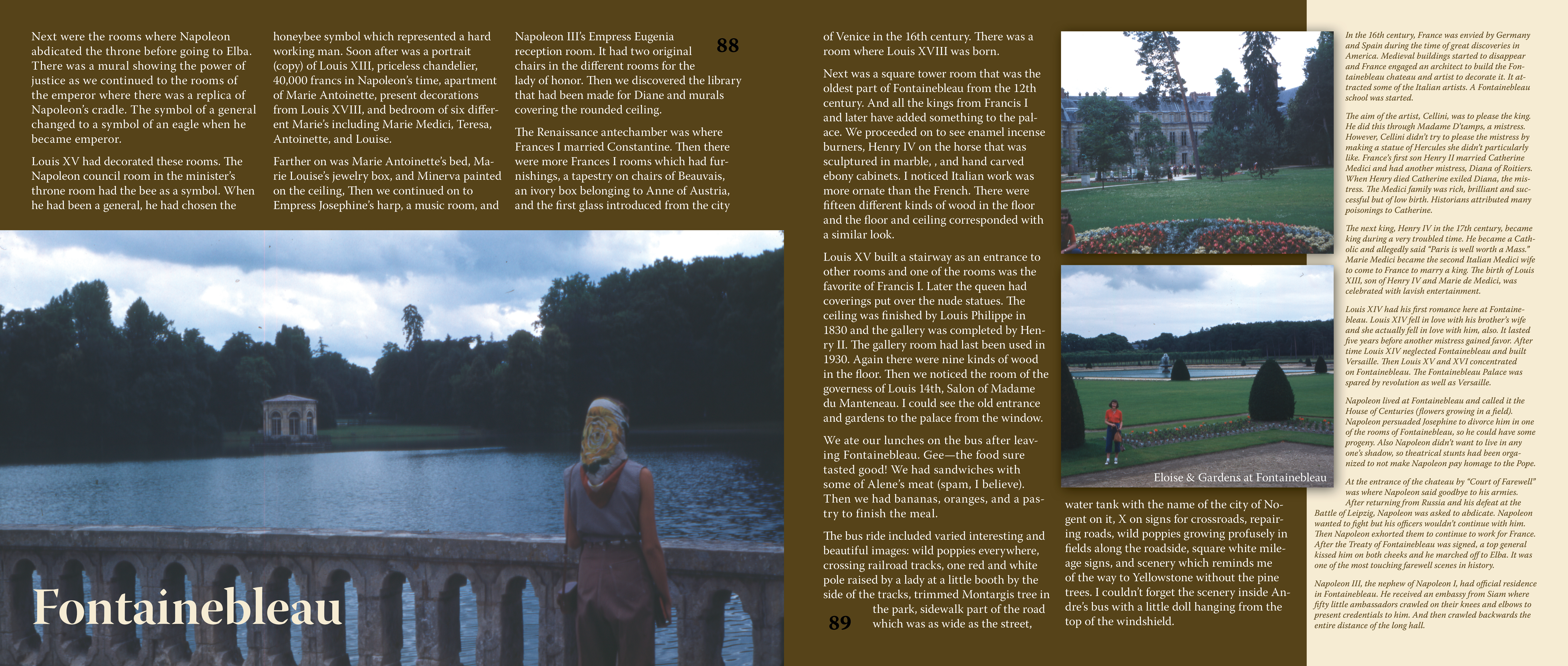 There were many hair-raising turns on the way down into LaSpezia. Andre had to back up on one curve to make it around the curve. LaSpezia was a seacoast city on a hill. I observed a building with dozens of white plaques covered with names on the outside. The whole town formed a military guard in front. I spied an old moat, some red and white flowers grouped around the plaza, and rows of palm trees along the beach. Later I caught sight of the seaport with flower stalls on the road. Then the valley widened and the road straightened out.