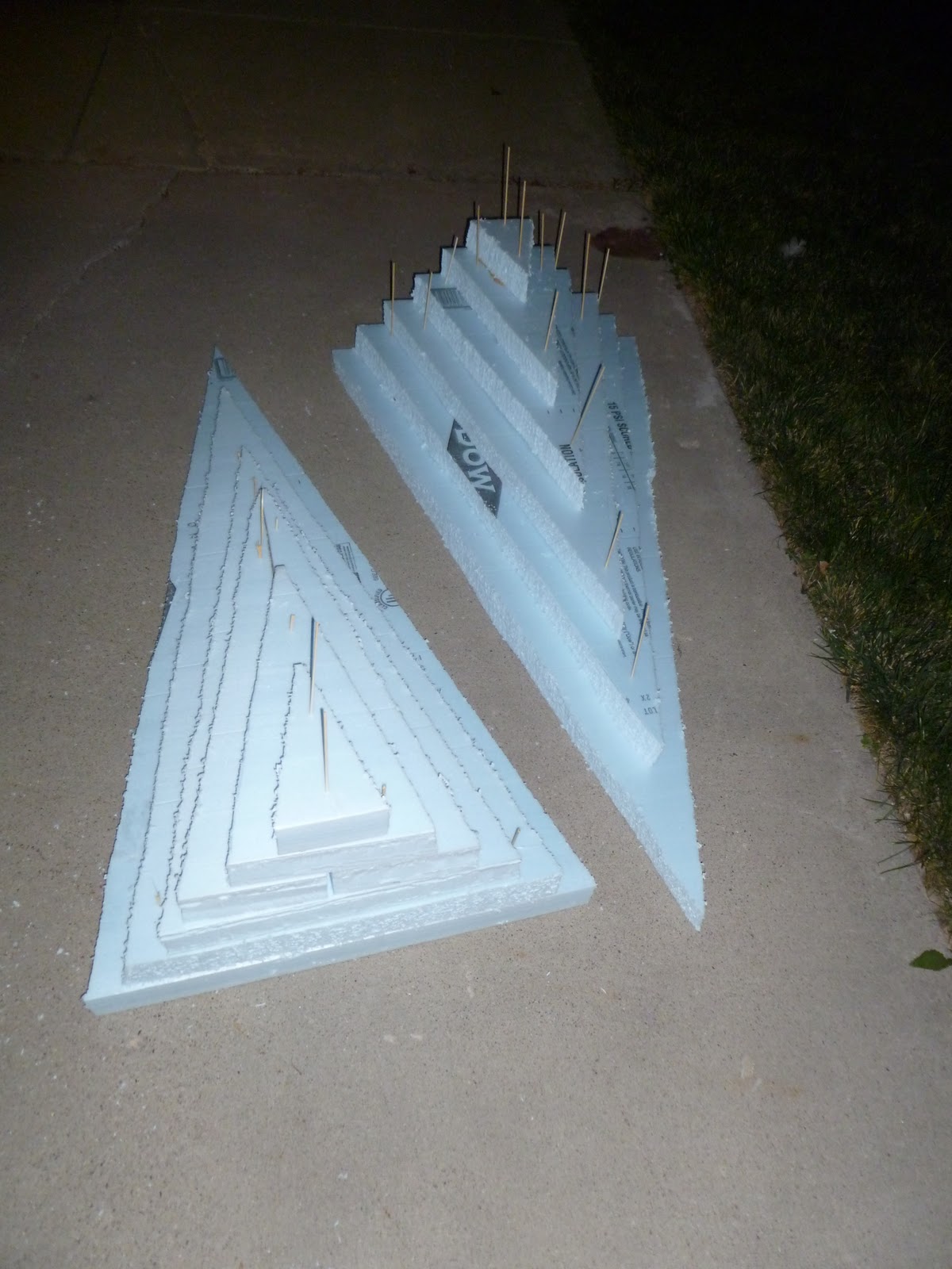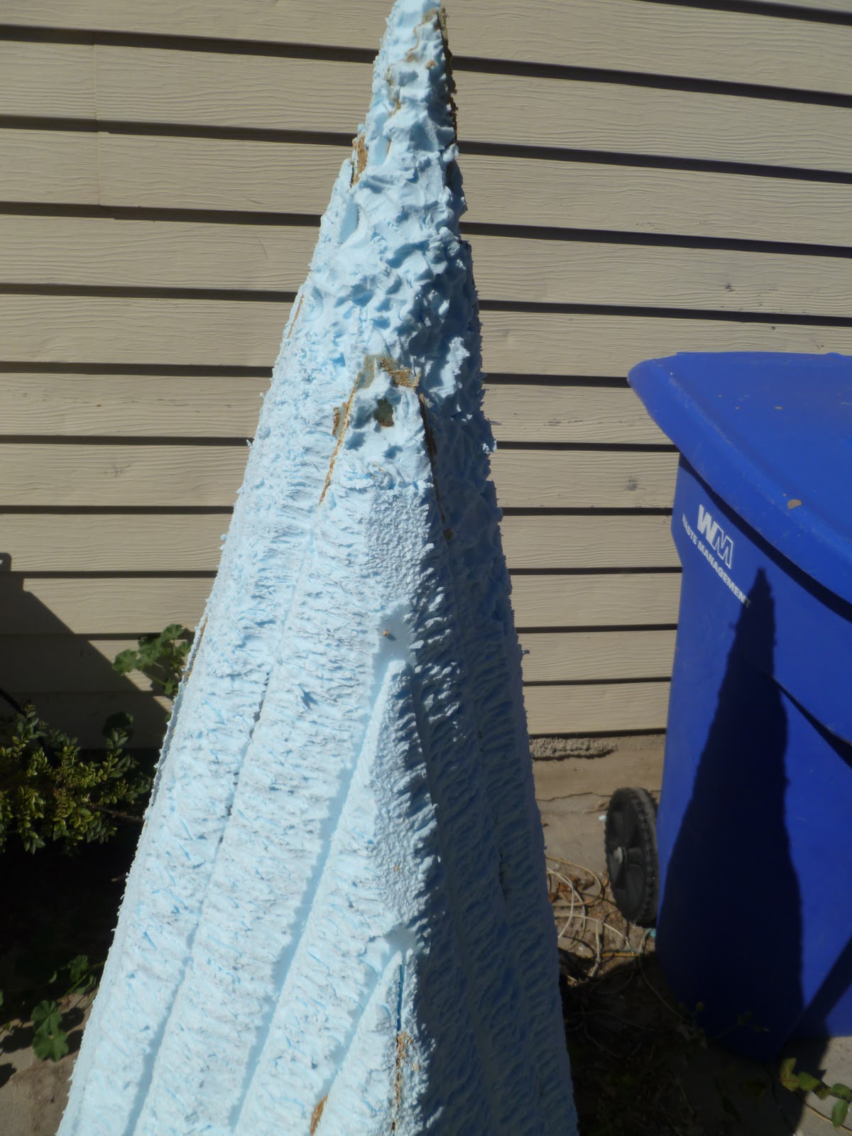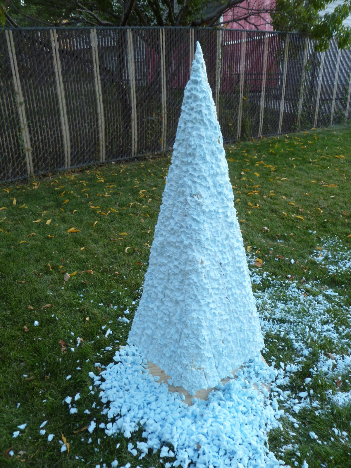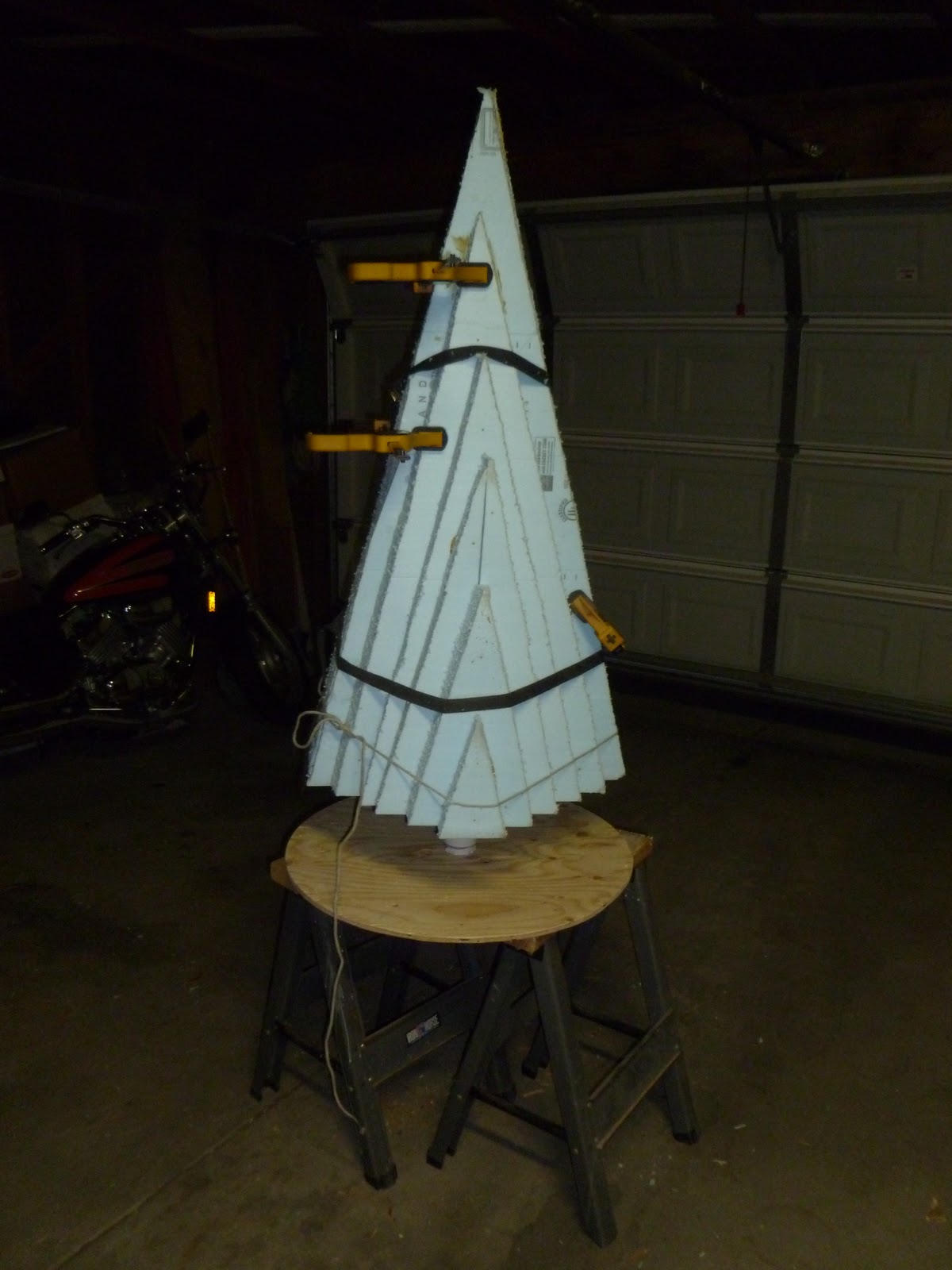 With Bill’s help we got the structure of the tree all put together. Yeah! We ran into a few snags but we go through them all. First Bill couldn’t fine his jig saw so we had to cut the plywood base by hand. I had to make three trips to Lowes to get things. First the plug I got for the end of the pvc pipe didn’t fit inside the pipe because it was the same side. So I went to find the right size. I couldn’t see one so I got a coupler and that fixed that problem. Next the 1″ bolt I got was too short. By the time we got all the layers – metal plate, washer, plywood, pvc plug and two more washers there wasn’t any bolt at all to put the nut on. So I went and picked up a 2″ bolt. After we got the support system all assembled we started gluing together all the Styrofoam tree parts. Then we ran out of liquid nail on the last big piece to stick together. So I made one last trip to Lowes.