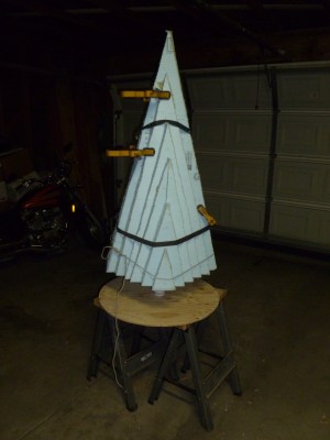 It feel so good to have this phase of construction done. Bill is happy with how the support system worked out too. Now I should be able to do the rest of the project without any help from Bill. Next week I want to get the tree to its final shape, insert the Christmas lights and paint the structure. If possible I’d also like to rough in the large objects that go under the tree.