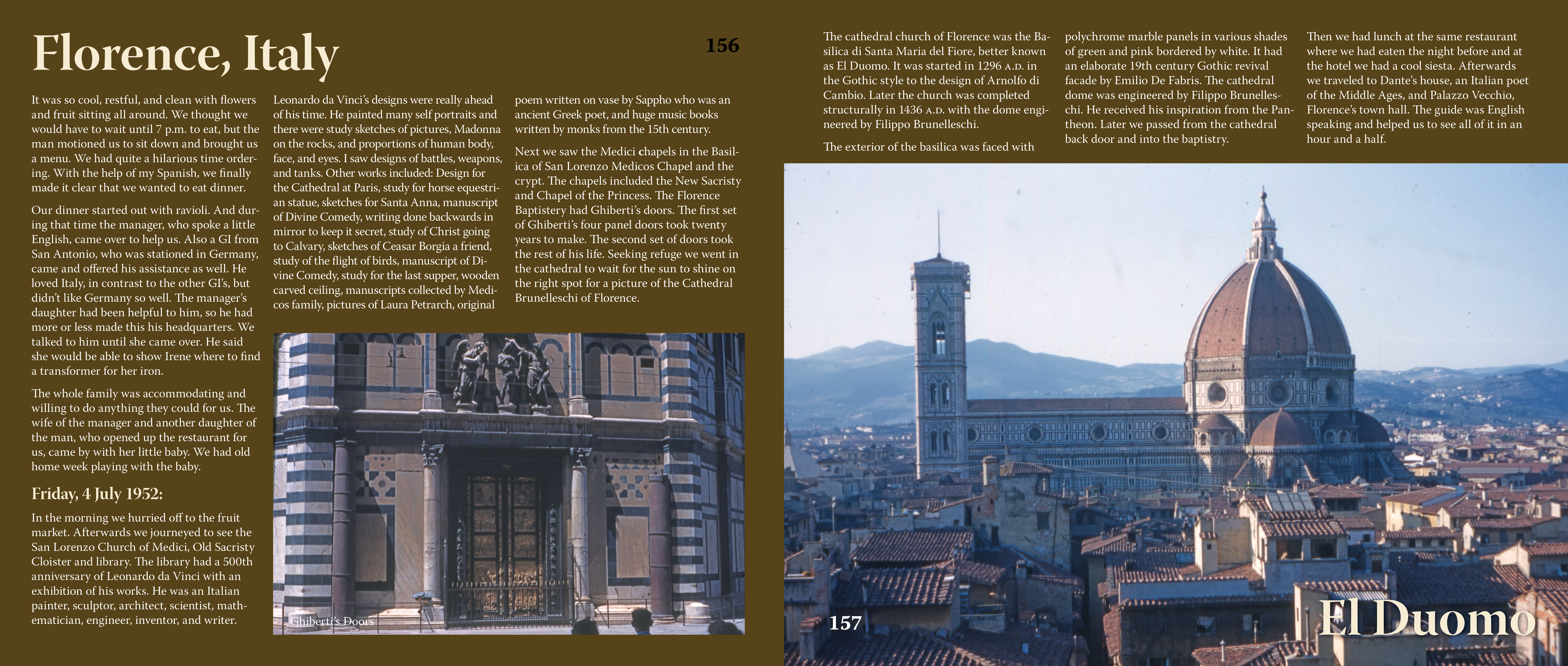 In a small church in Milan, (Santa Maria de la Grazie) we saw what is now left of da Vinci’s painting The Last Supper. The building itself, bombed during the war, is now reconstructed. The painting though somewhat protected from bombs is being restored. It is told that when da Vinci was searching for a model for Judas in the picture, he found him on the street and approached him. The man answered, “Yes, I will pose for you. It is I who posed for you many years ago when you painted Christ.”Leonardo da Vinci’s pen sketches of art subjects, music, architecture, engineering and science still hold good. In the library of the San Lorenz church are original manuscripts of Dante’s Inferno, Petarch and Laura and account books dating back to B.C., choral books with their square notes and four-lined staff, a wise sayings book by Cecco D’ Ascoli, a book of Greek poetry by Boctchio and Sappho.
