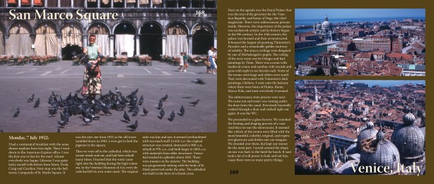 I had a continental breakfast with the same dinner napkins from last night. Then I went down to the American Express office. I was the first one in line for the mail. Almost everybody was happy. Likewise I was quite lucky myself with letters from Mom, Twila, Craig and Caroline. Next stop was the bell tower, Campanile of St. Marks Square. It was the new one from 1912 as the old tower tumbled down in 1902. I even got to feed the pigeons in the square.