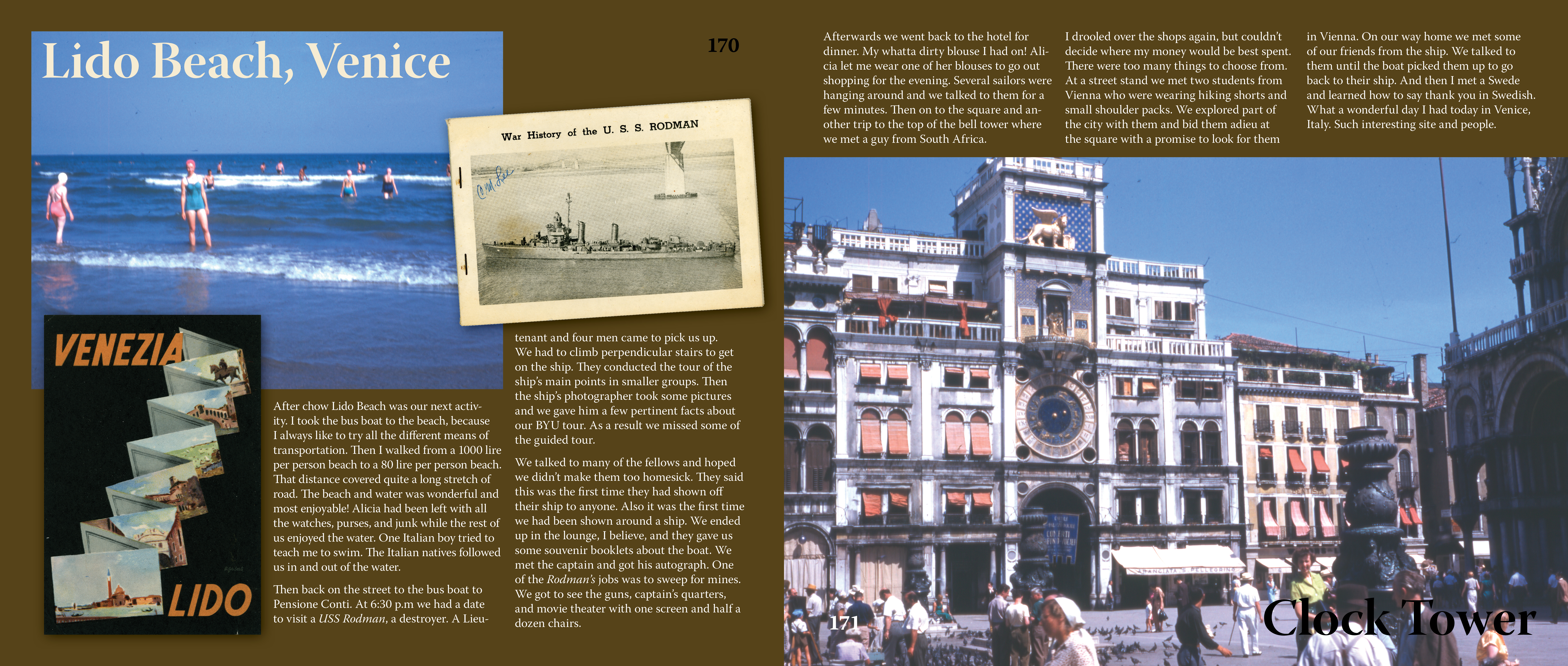 Then back on the street to the bus boat to Pensione Conti. At 6:30 p.m we had a date to visit a USS Rodman, a destroyer. A Lieutenant and four men came to pick us up. We had to climb perpendicular stairs to get on the ship. They conducted the tour of the ship’s main points in smaller groups. Then the ship’s photographer took some pictures and we gave him a few pertinent facts about our BYU tour. As a result we missed some of the guided tour.