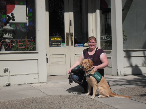 As we got off Trax about a block from the festival we started to notice the costumes. Some people were dress in traditional Japanese dress. But more common were young people dressed in all kinds of fanciful ways, with cat ears, tails and other kinds of animals. There were a couple of booths about anime so we think that the costumes were from Japanese cartoons. Most of one side of the street were food booths. The other side of the street had booths with merchandise. The most popular items were colorful umbrellas and samurai swords. We saw several dogs including a working dog from CCI (Canine Companions for Independence). The CCI dog was a yellow lab, who showed interest in Yakira but was not distracted by her.They also had an open house at the local Buddhist temple, so we walked around it for a bit.