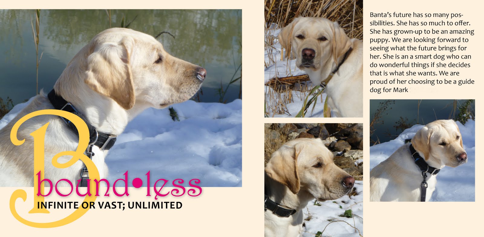 Banta’s future has so many possibilities. She has so much to offer. She has grown-up to be an amazing puppy. We are looking forward to seeing what the future brings for her. She is an a smart dog who can do wonderful things if she decides that is what she wants. We are proud of her choosing to be a guide dog for Mark.