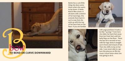 Banta has a cute little thing she does sometimes when she wants to lay down. It looks kind of like a bow. It all starts with a stretch of her back legs. She extends them back in such a way that she ends up with the top of her back feet on the floor. If you are familiar with yoga positions it looks a lot like “up dog.” From here she slides her back feet away from her front feet until she belly flops on the floor. There she lays for a second or two with her legs stretch straight out in front and in back of her. Then she shifts to lay on her side. I was never able to capture this process on film because I never knew when she was going to do it.