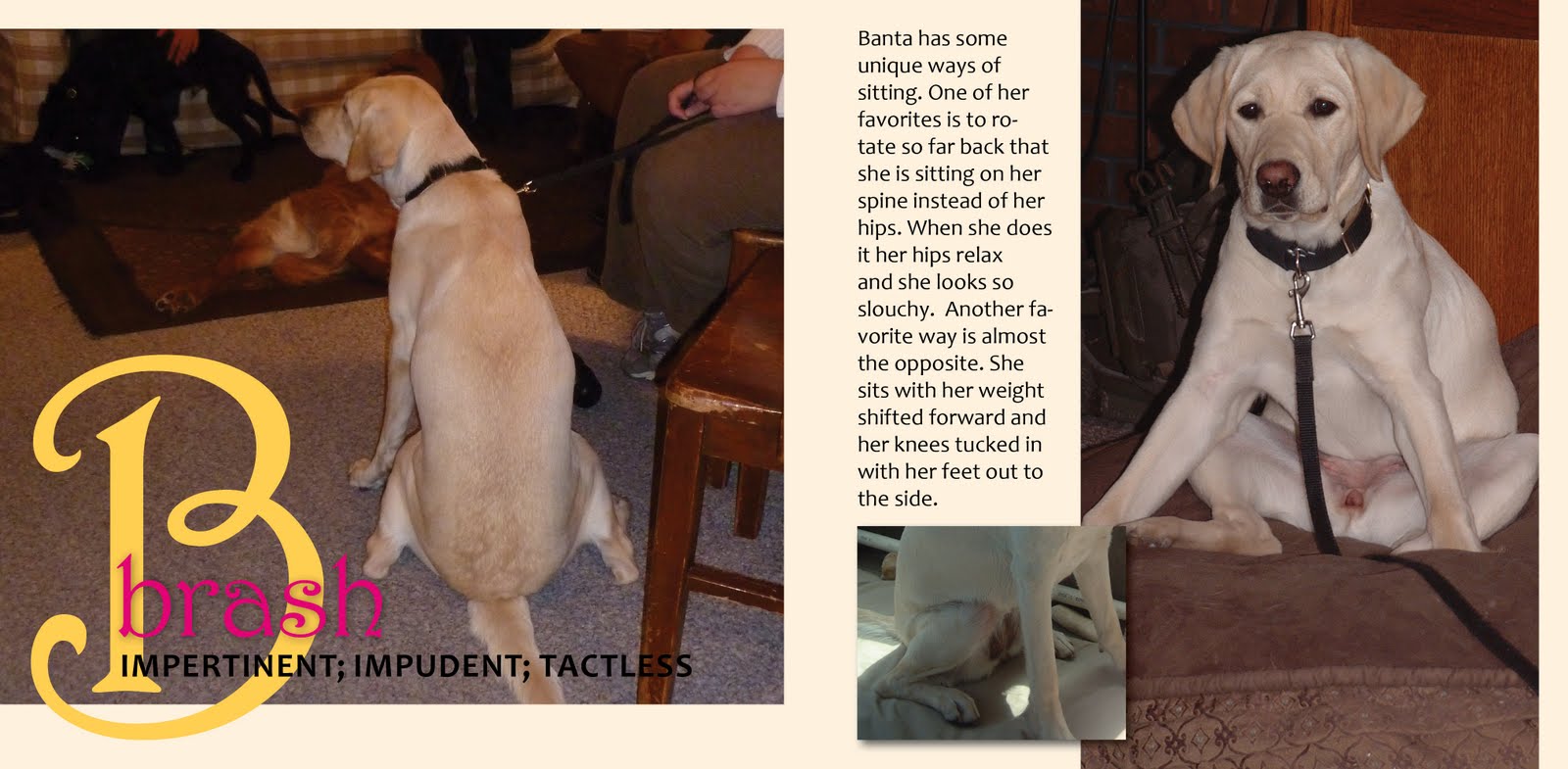 As a puppy Banta was a challenge. She would sometimes do things just because she could, in kind of a rebellious way. For example on walks she would pick-up something off the sidewalk not because she really wanted it but because you had prevented her from doing something else she wanted to do and it was her way of showing her independence. One thing you didn’t want to get into with Banta was a battle and trying to get something out of her mouth was one of the worst battles. As she matured Banta chose not to be so bullheaded about things and it was rare for her to pick-up something off the ground.