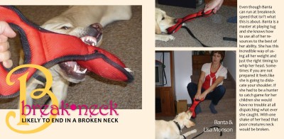 Even though Banta can run at breakneck speed that isn’t what this is about. Banta is a master at playing tug and she knows how to use all of her resources to the best of her ability. She has this incredible way of using all her weight and just the right timing to whip her head. Sometimes if you are not prepared it feels like she is going to dislocate your shoulder. If she had to be a hunter to catch game for her children she would have no trouble at all dispatching what ever she caught. With one shake of her head that poor creatures neck would be broken.
