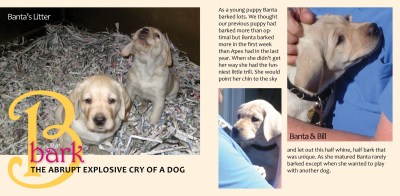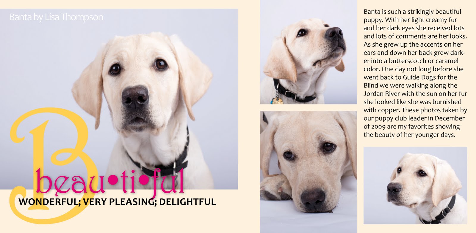 Banta would get very excited in the evening when she would hear the garage door open. She would run to the window to look out or run to the door to wait for Bill to come in. At her last puppy class before leaving for San Rafael one of the other raisers commented on how bonded she is to us. I know that she will make that same kind of bond with someone else in her future.
