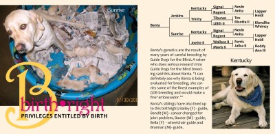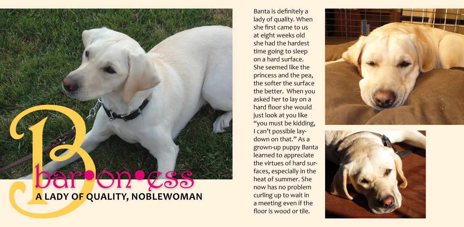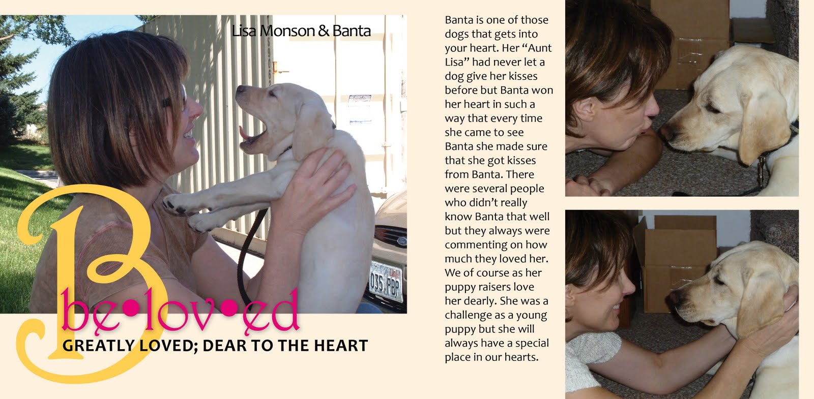 Banta is good at making connections with others. She is of course bonded to us as her puppy raisers. She loves to have snuggle time either taking a nap or curling up between you legs while you sit on the ground.