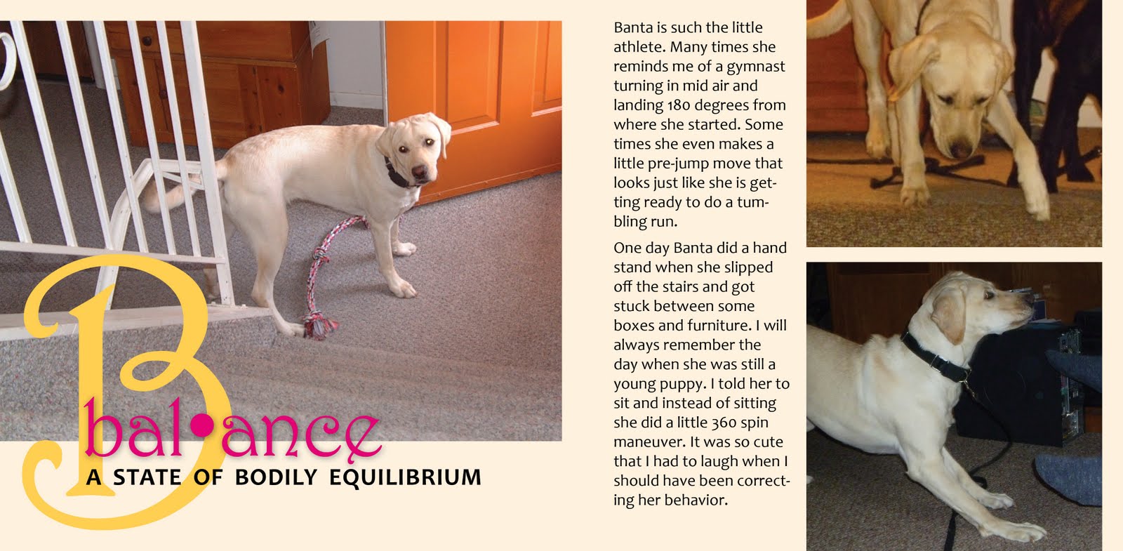 One day Banta did a hand stand when she slipped off the stairs and got stuck between some boxes and furniture. I will always remember the day when she was still a young puppy. I told her to sit and instead of sitting she did a little 360 spin maneuver. It was so cute that I had to laugh when I should have been correcting her behavior.