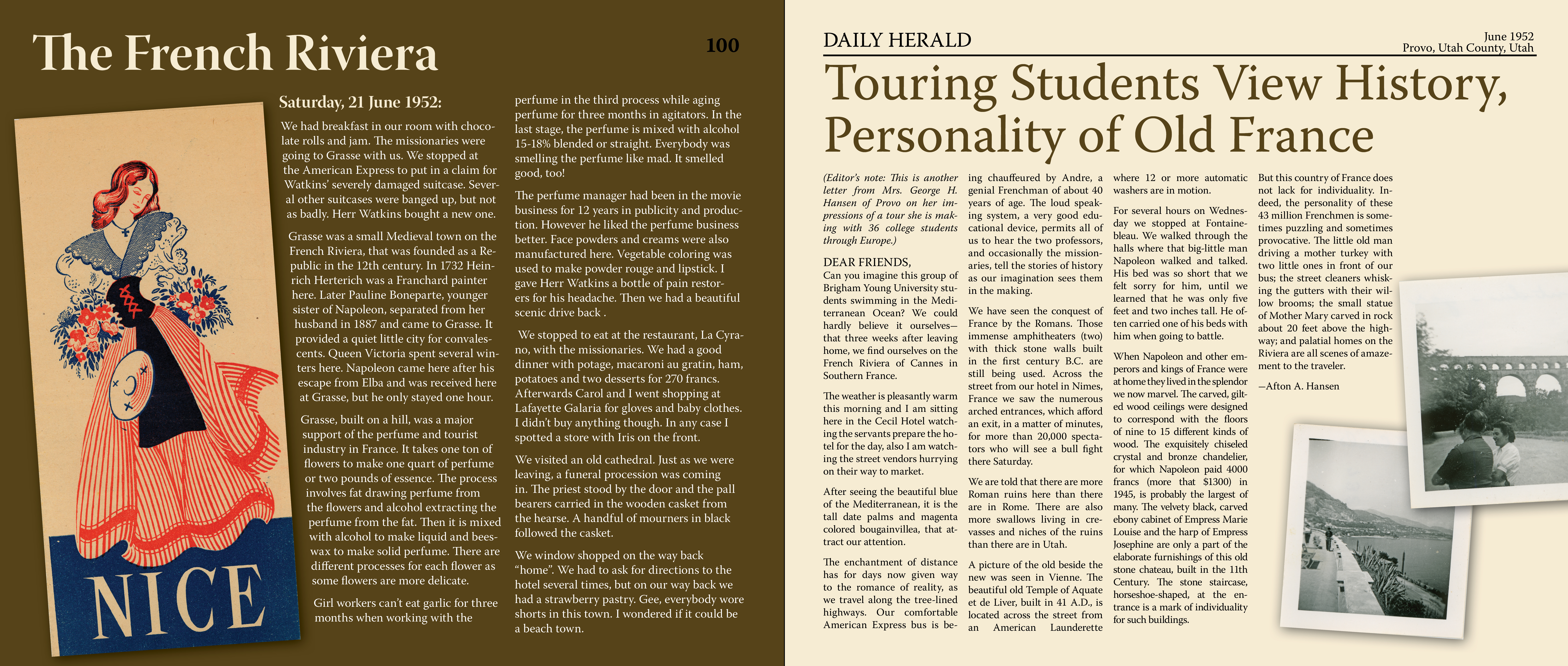 Now we’re off for Sorrento. The view from the bus window en route was superb or more so than heretofore. Mount Vesuvius and the Island of Capri looked like thick purple mists on opposite horizons. The road curved high above the edge of the Mediterranean Sea and olive trees terraced from the sea edge to the roadside. I tried to pick out our hotel as Sorrento buildings came into view across a strip of the Mediterranean Sea. There were plumed horses pulling buggies through the streets.