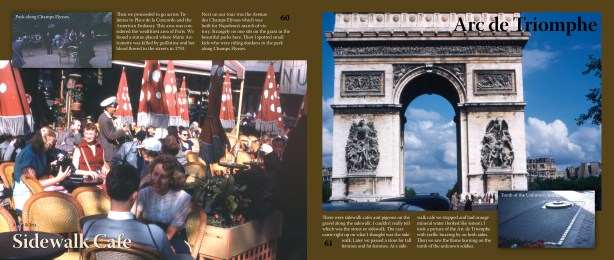 There were sidewalk cafes and pigeons on the gravel along the sidewalk. I couldn’t really tell which was the street or sidewalk. The cars came right up on what I thought was the sidewalk. Later we passed a store for tall femmes and fat femmes. At a sidewalk cafe we stopped and had orange mineral water (looked like lemon). I took a picture of the Arc de Triomphe with traffic buzzing by on both sides. Then we saw the flame burning on the tomb of the unknown soldier.