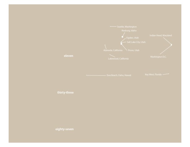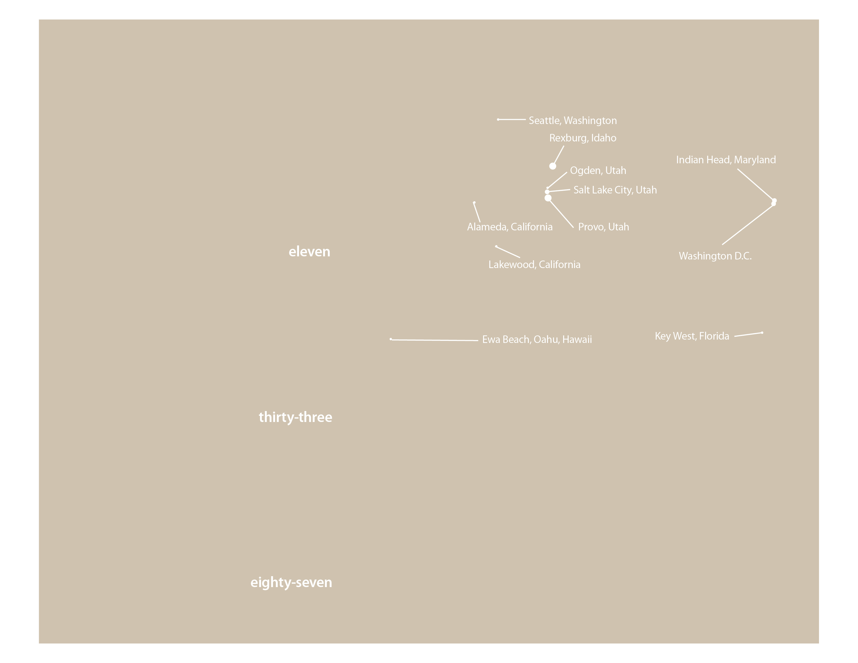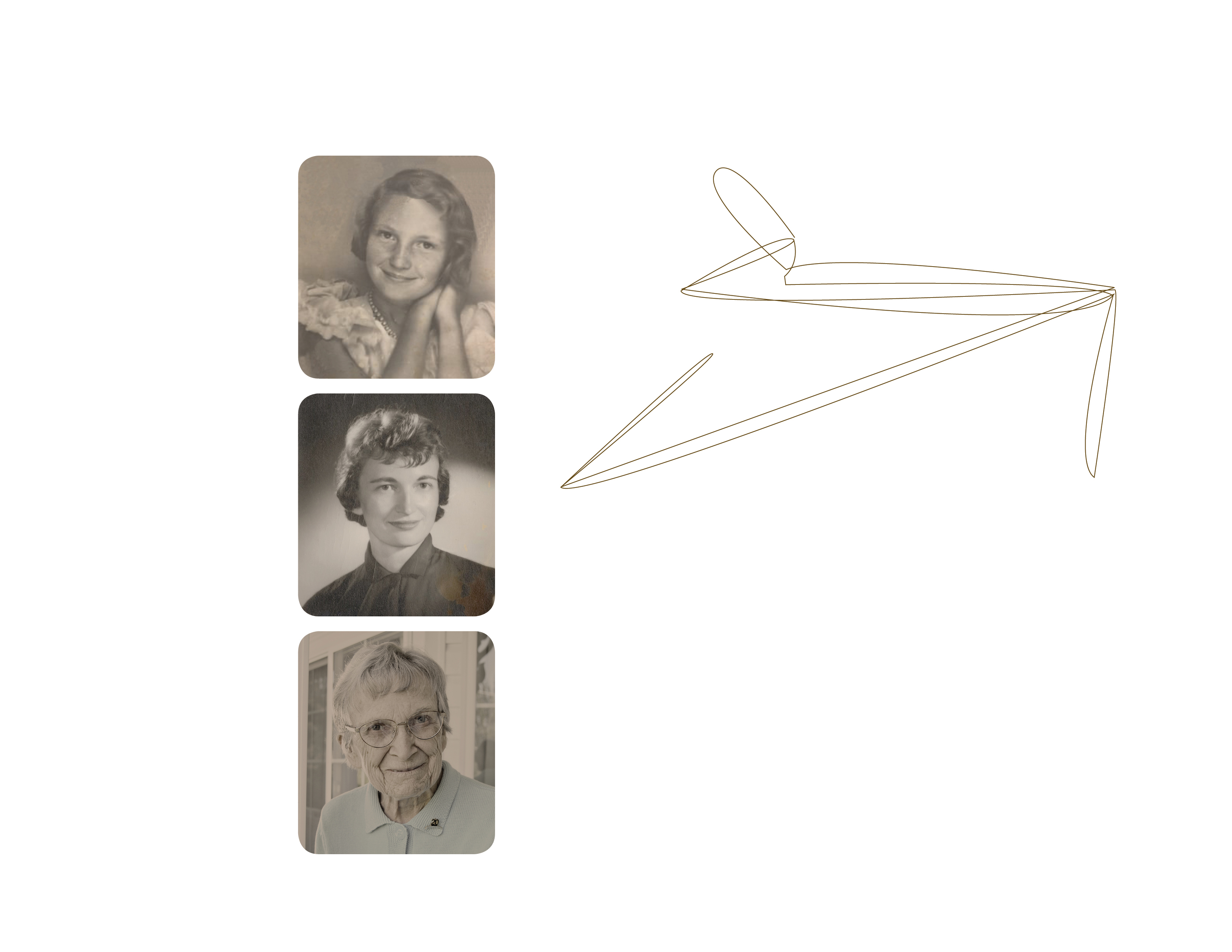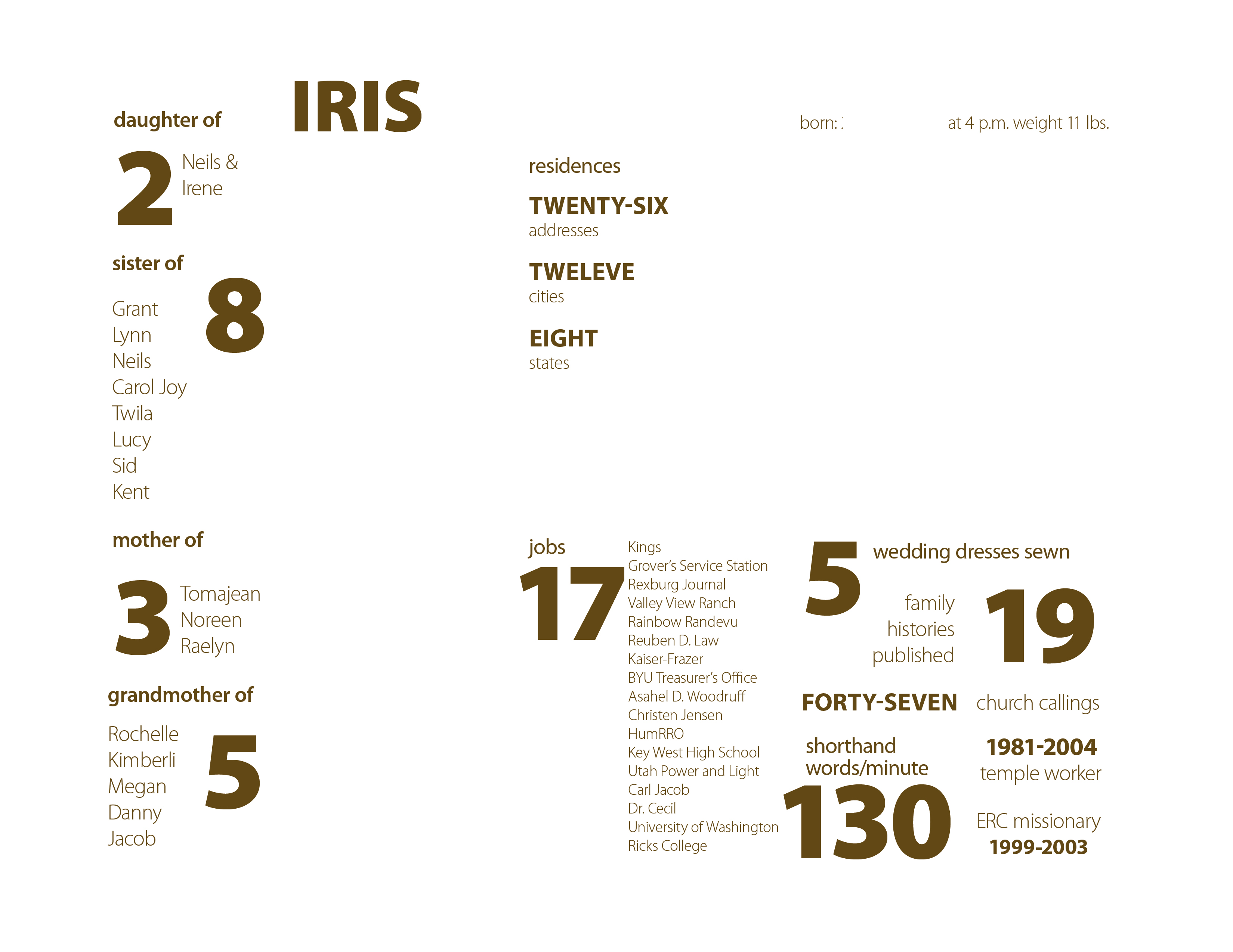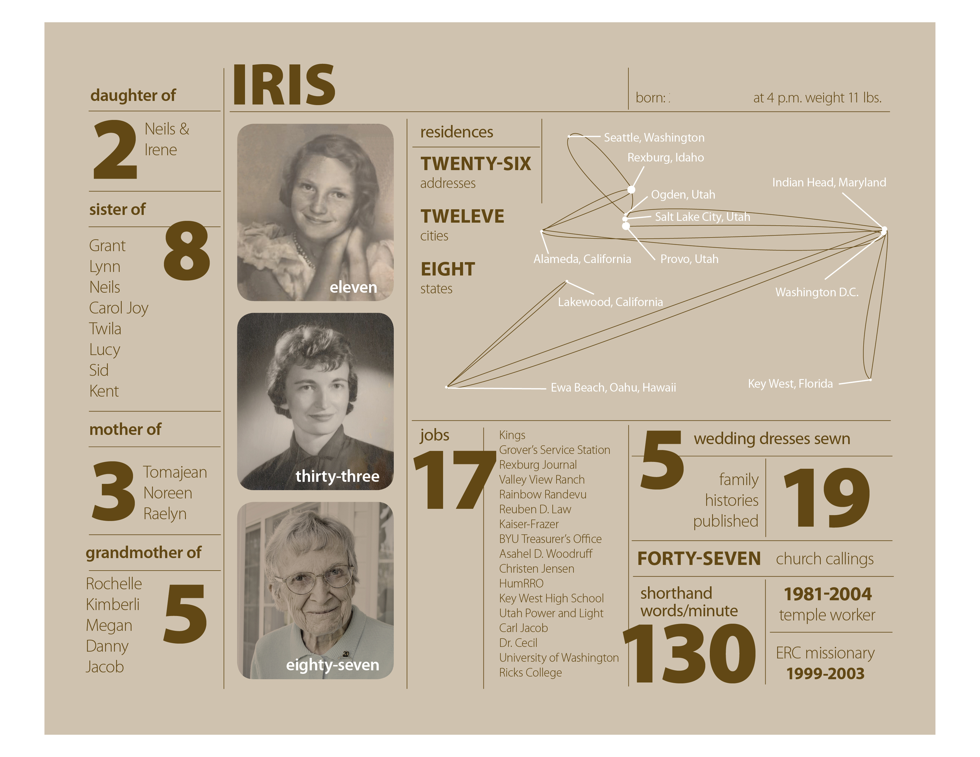 The fourth layer is for the photos. After I picked the three photos I wanted to use I edited them in Photoshop using color matching to give them all an old sepia tone look. This layer also includes the brown lines on the residences “chart”. I drew these lines in InDesign with the pen tool. I started with a map of the United States and used that as a guide for drawing lines from Rexburg, where she was born, to each city she lived in. Then I deleted the map leaving the lines.