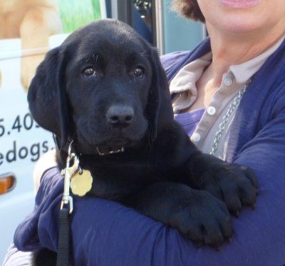 We got Fable on the puppy truck early Sunday morning without mishap. She was excited to go and started up the steps before it was our turn. Once in her assigned kennel on the truck she was more interested in saying high to the female lab across the aisle and male golden retriever next to her than in saying good-bye to us. No surprise there.