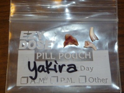 Yakira is well into the teething process. I’ve found three teeth so far. She lost all her tiny front teeth a few weeks ago. But they are so small that finding one of them is almost impossible. With every puppy I think they are going to go through teething and I’m not going to find any teeth. But so far I’ve been wrong. I found the first tooth on Friday, one of her canines. The second was on Saturday. We were playing tough with her new rope she got for Christmas and one of her back teeth came out. I think this one may have hurt a little bit coming out. There was lots more root left on than usual. Then yesterday I found another canine on the floor. There is a small chance this tooth might be Osaka’s. She lost the last of her canines while she was here for a sleep over but it seems to be a good match in size and color or Yakira’s other tooth. I like to put the puppy teeth into a little plastic zip-top bag with their name on it. This way I can tell whose teeth are whose. One of these days I’m going to put together a little box for each puppy with things like their teeth and their puppy collars in it.