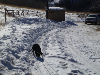 My family has the tradition of going into the mountains to cut down our own Christmas tree. We like to go the Saturday after Thanksgiving. There wasn’t much snow down in the parking lot but it got deeper as we climbed the hill to our favorite area to find a tree. Yakira had a great time. She got a little cold when we got off the beaten path and the snow was deeper than her legs. I sat down on a log and picked her up, cuddling her inside my coat until she warmed up. Meanwhile Bill got our tree cut down and headed off to help Eric and Danny get their tree down the hill. Our tree is rather little because we put it up on a trunk. This keeps the tree from being too tempting to the puppies. But my sister’s house had 16′ ceilings in their living room so their tree is much bigger and is hard to get down the hill. I was really impressed by Yakira on our trek back down the hill with the tree. She just plugged her way along, keeping a steady pace until we got back to the car.